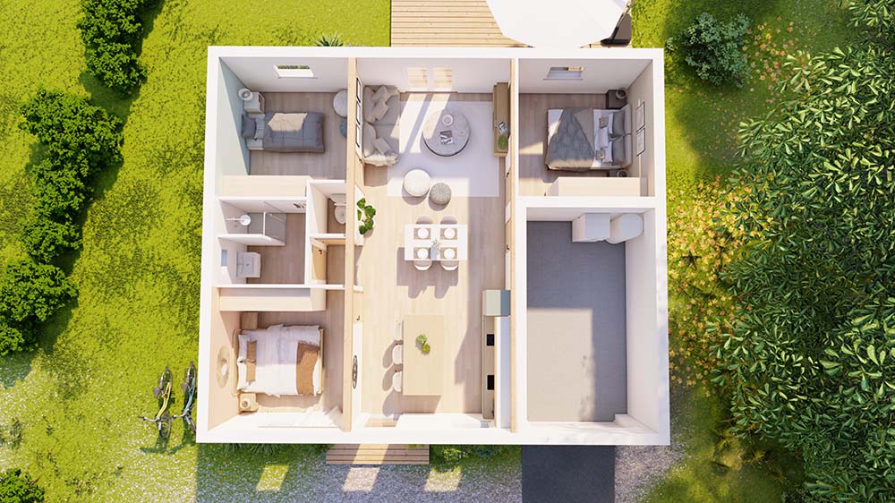 Modèle « Clé en main » tout équipé optimisé et aménagé pour la location, le travail, les loisirs ou pour y vivre à l’année.
