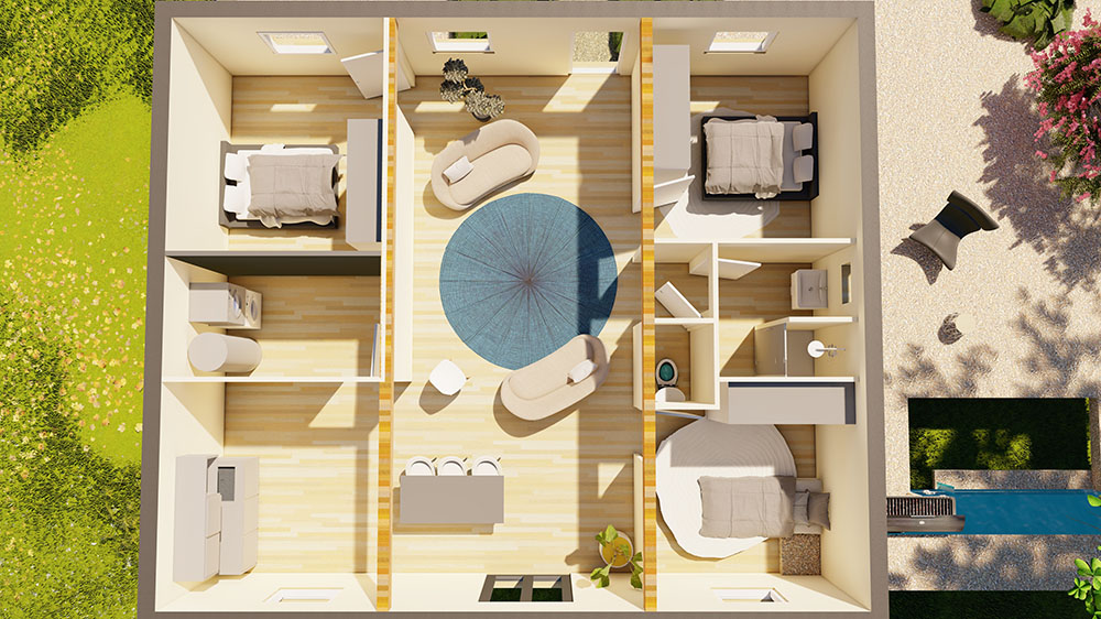 Modèle « Clé en main » tout équipé optimisé et aménagé pour la location, le travail, les loisirs ou pour y vivre à l’année.