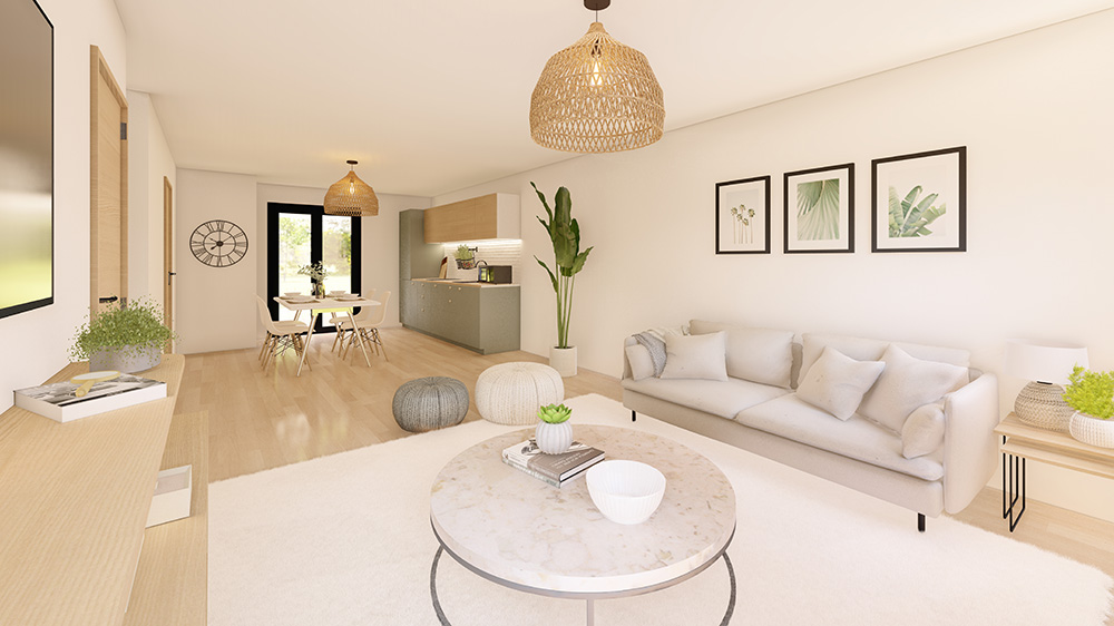 Découvrez cette maison fonctionnelle de 85 m² pour toute la famille avec trois chambres, salon-séjour, cuisine avec cellier, salle d’eau et WC.