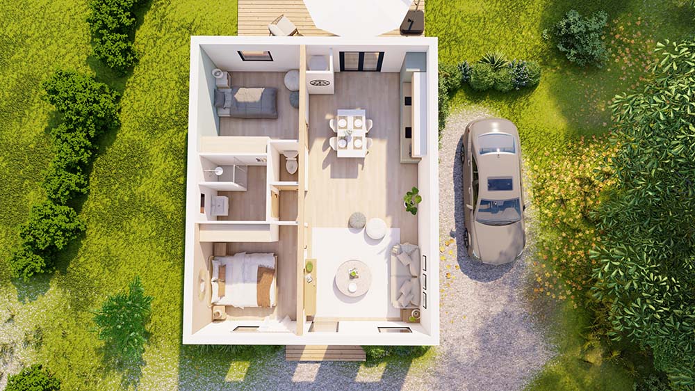 Modèle « Clé en main » tout équipé optimisé et aménagé pour la location, le travail, les loisirs ou pour y vivre à l’année.